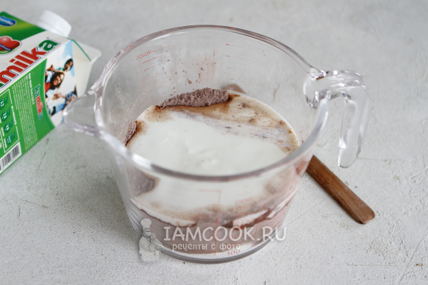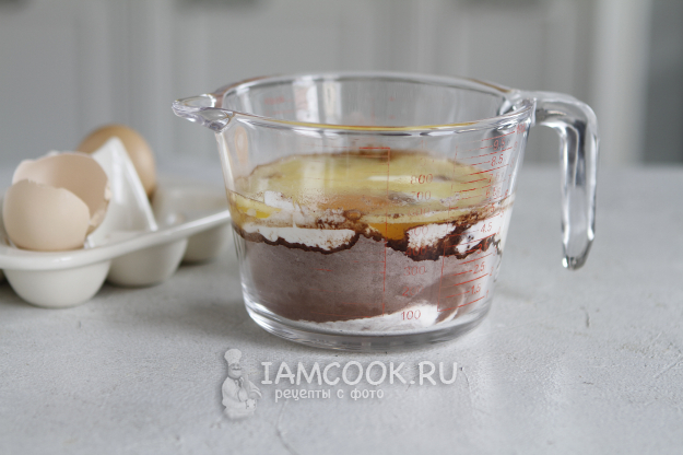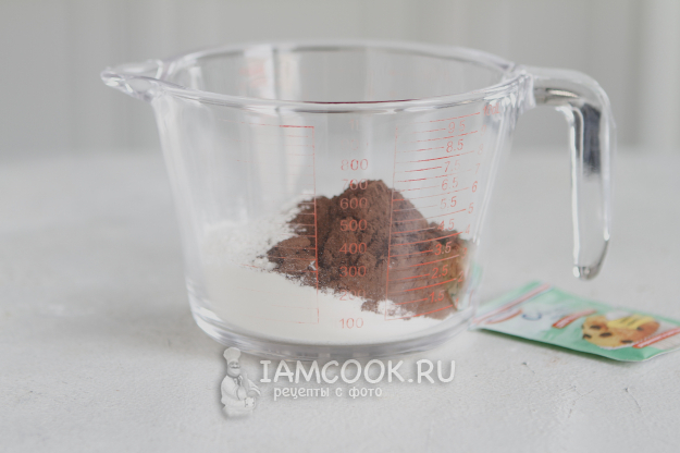 Просейте пшеничную муку, добавьте соду и какао-порошок.