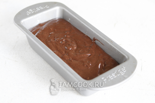Подготовьте форму для кекса, хорошо смажьте ее маслом. Выложите в нее шоколадное тесто. Важно: не наливайте теста больше, чем до половины формы. В процессе выпечки кекс хорошо поднимется.
