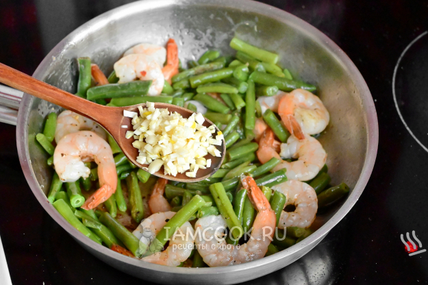 Креветки со стручковой фасолью перемешайте, добавьте нарубленный зубчик чеснока.