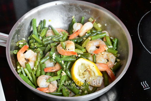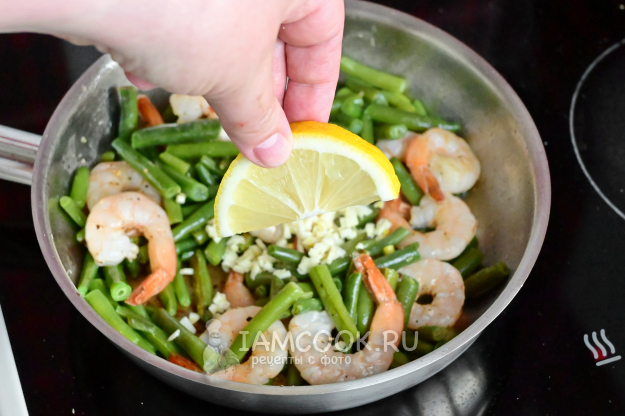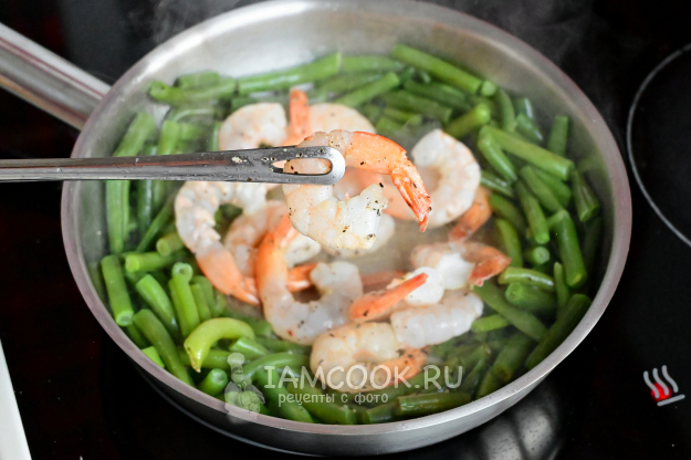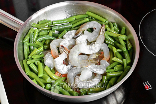 Сдвиньте стручковую фасоль к краю сковороды, а в центр выложите замороженных креветок.