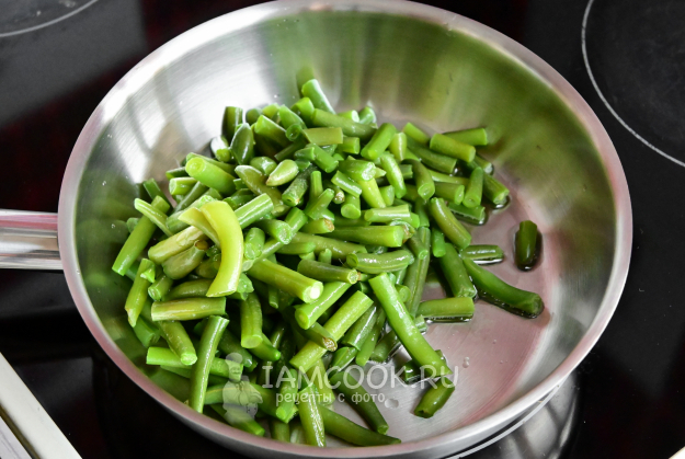 Добавьте в сковороду стручковую фасоль и обжарьте её примерно 5-7 минут на сильном огне. Фасоль должна остаться немного хрустящей.