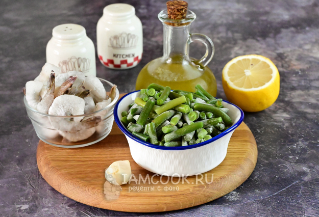 Для приготовления стручковой фасоли с креветками на сковороде соберите все продукты по списку.