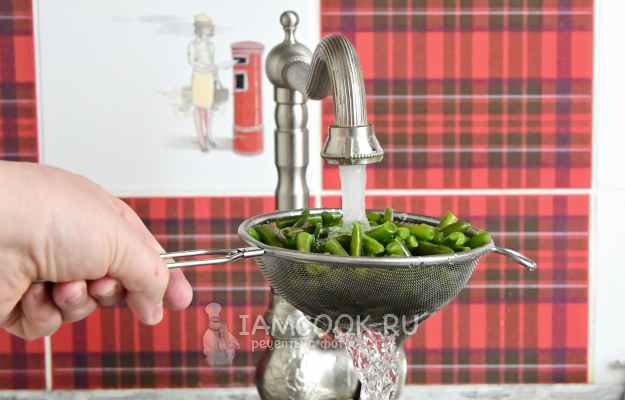 Замороженную стручковую фасоль всыпьте в сито и промойте под проточной холодной водой, чтобы быстро её разморозить и смыть остатки льда. Дайте всей воде стечь.