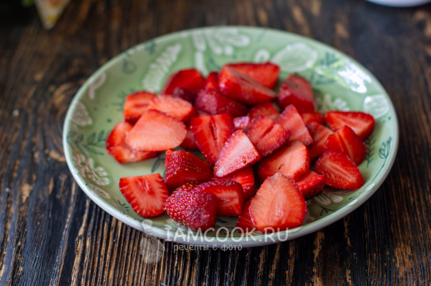 Клубнику переберите, помойте и обсушите. Нарежьте ягоды на ломтики.