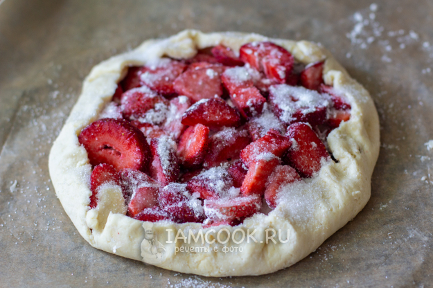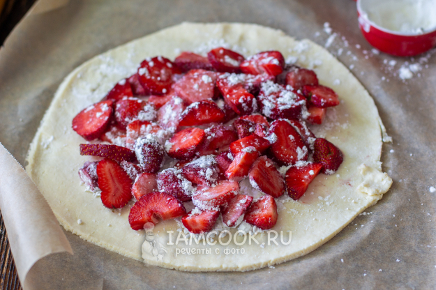 На тесто распределите половину (1 столовая ложка) кукурузного крахмала, а сверху выложите подготовленную клубнику. Сверху клубнику посыпьте оставшимся крахмалом (1 столовая ложка) и ванильным сахаром. Кукурузный крахмал можно заменить на картофельный.