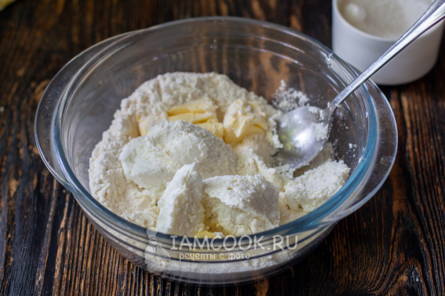 Тесто для галеты можно приготовить удобным для вас способом. Можно замешивать руками или с помощью кухонных девайсов. Я замесила руками. Для этого в глубокую миску всыпьте просеянную муку, соль и разрыхлитель. Добавьте холодное сливочное масло, нарезав его на кусочки, сахар и творог. Обратите внимание, у меня творог максимально сухой. Если у вас более влажный, то и количество муки нужно будет немного увеличить.