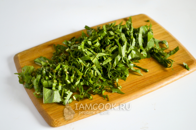 Слейте воду с листьев одуванчика, обсушите их бумажным полотенцем и нарежьте тонкой соломкой. Укроп и зеленый лук также нарежьте.