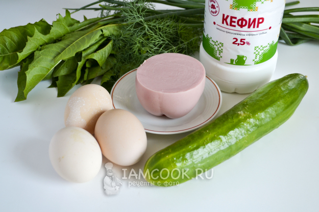Соберите продукты для приготовления окрошки из одуванчика. Свежий огурец, укроп, зеленый лук и листья одуванчика тщательно промойте. Яйца отварите и залейте холодной водой.