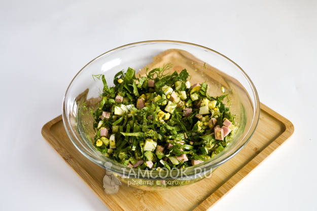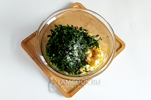Положите всю нарезанную зелень. Посолите и посыпьте черным молотым перцем.
