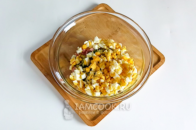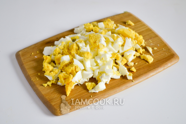 Нарежьте вареные яйца.