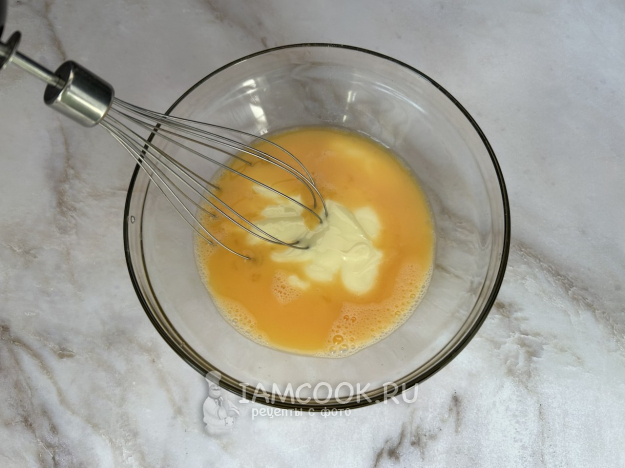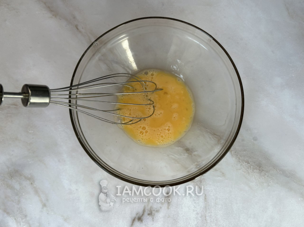 В глубокую миску вбейте яйцо, добавьте щепотку соли и ванилин. Всё взбейте венчиком.