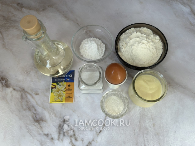 Соберите все необходимые ингредиенты для приготовления печенья со сгущенкой на сковороде.
