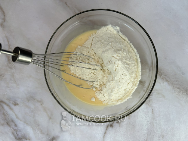 Просейте муку вместе с разрыхлителем и постепенно добавьте её в смесь сгущёнки и яиц. Заместите тесто.