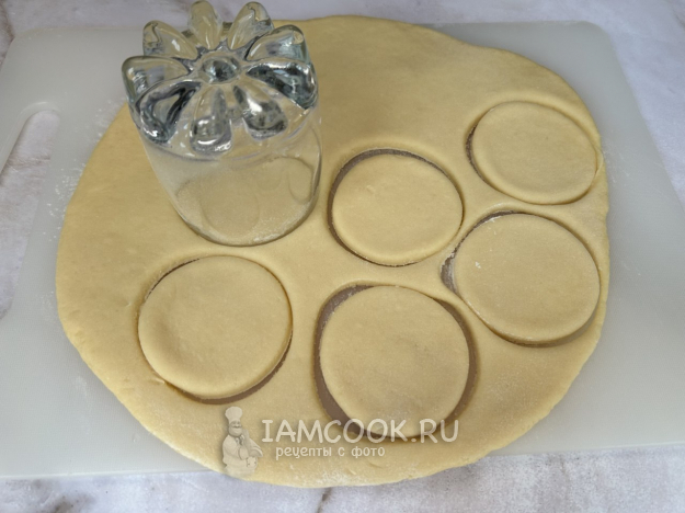 Раскатайте тесто слоем около 5 мм и стаканом вырежьте кружочки.