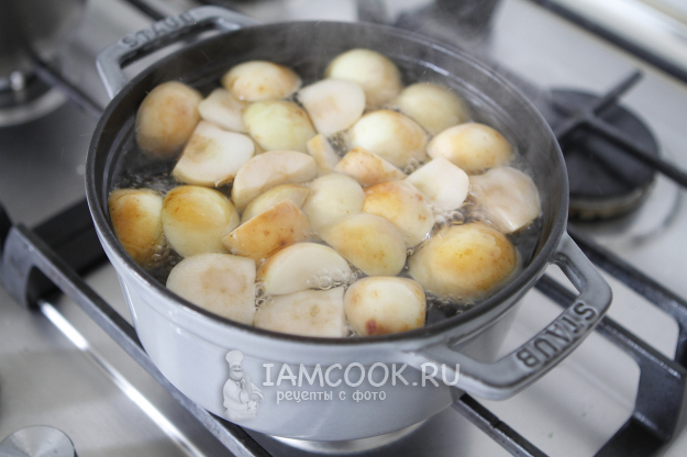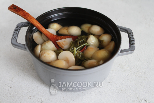 Кастрюлю отправляем на плиту и доводим всё до кипения. Убавляем огонь и варим 15 минут.