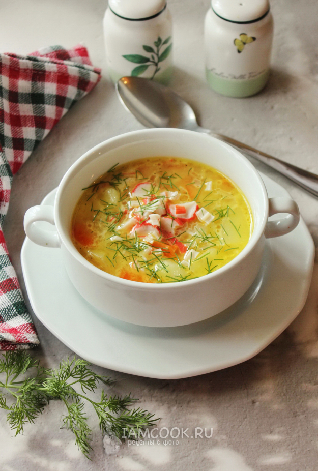 Сырный суп с крабовыми палочками готов.