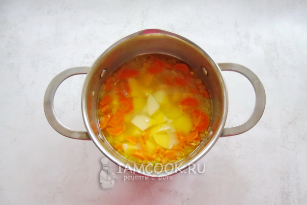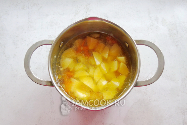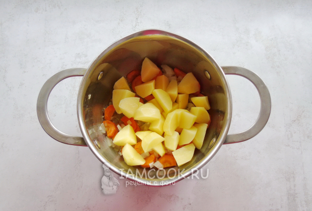 Картошку очистите, помойте и нарежьте кубиками. Добавьте в кастрюлю с луком и морковью.