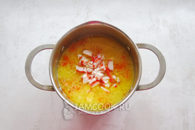 В конце приготовления добавьте нарезанные крабовые палочки, перемешайте и выключайте плиту.