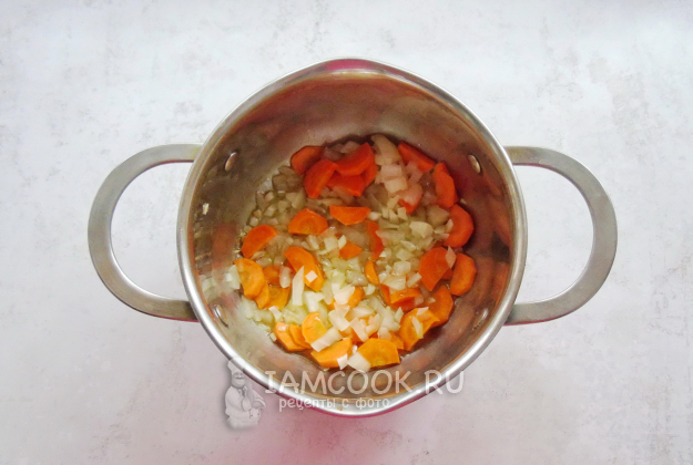 Налейте растительное масло и пассеруйте овощи до прозрачности лука.