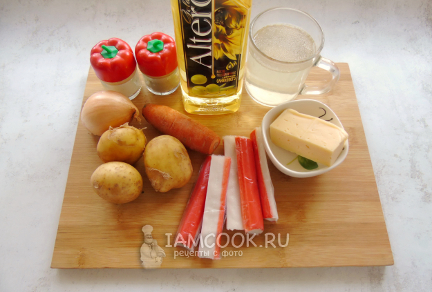Соберите ингредиенты для приготовления сырного супа с крабовыми палочками.
