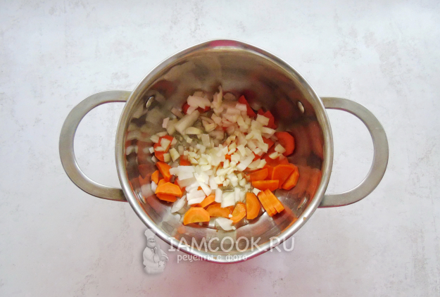 Лук, морковь и чеснок очистите, помойте и нарежьте произвольно. Морковь можно натереть на терке.