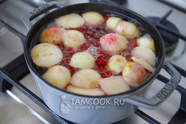 Варите компот из яблок и малины еще примерно 10 минут. Затем снимите кастрюлю с плиты и дайте полностью остыть компоту.