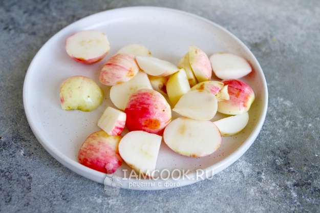 Яблоки у меня нового урожая, небольшие по размеру, кисло-сладкие. Их я хорошо промыла под проточной водой. Разрезала на 4 части, удалила косточки и сердцевину.