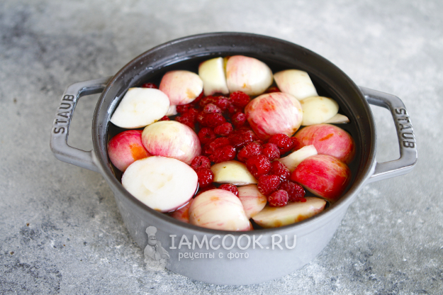 Давайте соберем все продукты по списку и приступим к приготовлению компота из яблок и малины.