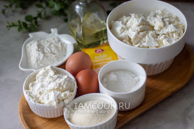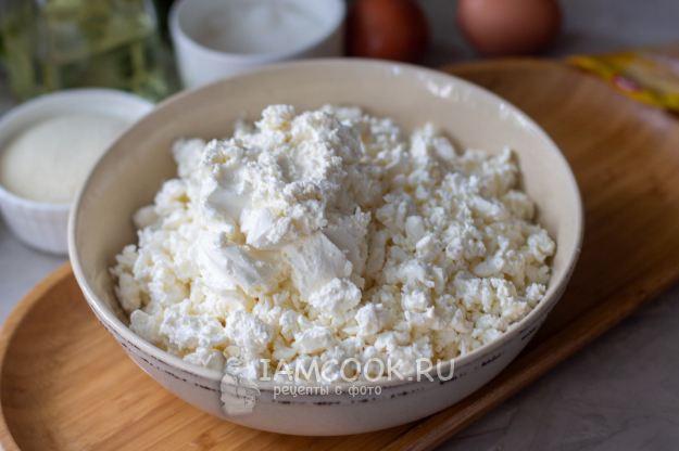 Соберите необходимые продукты для приготовления сырников с творожным сыром и творогом. Чтобы сырники получились вкусными и пышными, возьмите сухой творог. Если у вас творог сильно влажный, то откиньте его на сито и дайте стечь лишней сыворотке. Не забивайте творожную массу манкой или мукой! На 500 граммов творога достаточно всего 2 столовых ложки манной крупы (муки). Творожный сыр возьмите обычный, классический, без добавок.