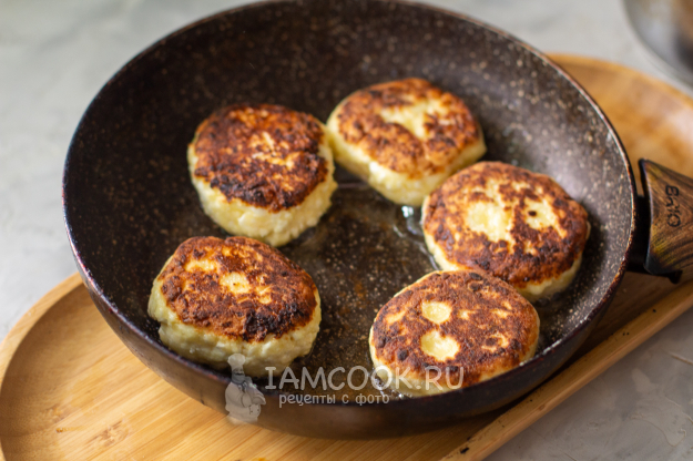 В сковороде разогрейте растительное масло, выложите подготовленные сырники и жарьте их при небольшом нагреве с двух сторон по несколько минут.