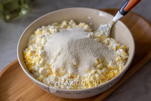 Всыпьте манную крупу и тщательно перемешайте творожную массу.