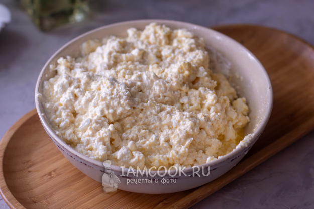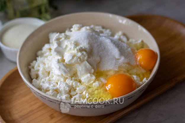 Добавьте 2 небольших куриных яйца (или 1 крупное), соль, сахар и ванилин. Не увеличивайте количество сахара, лучше при подаче полейте готовые сырники медом или сгущенкой.