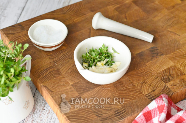 Добавьте сюда нарубленный произвольно крупный зубчик чеснока и пару щепоток крупной соли.