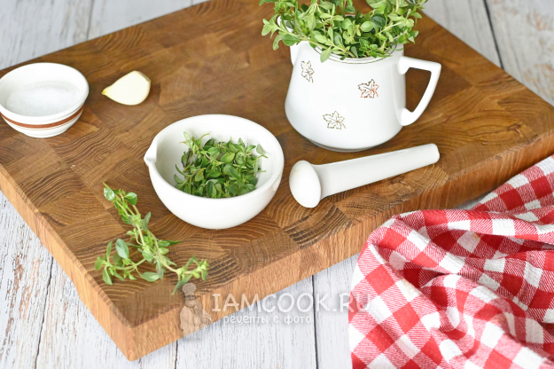 Добавьте к нему растёртые в ступке тимьян с чесноком.