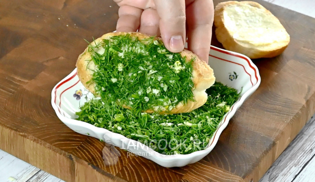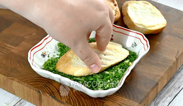 А теперь намазанной маслом стороной окуните ломтики багета в укроп с чесноком. Плотно прижмите руками, чтобы к маслу прилипло как можно больше укропа.