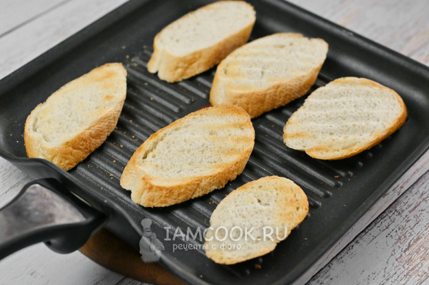 Нарежьте на ломтики багет или батон и подрумяньте их на сухой сковороде с двух сторон (или в тостере).
