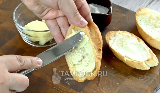 На подрумяненные кусочки багета намажьте тонким слоем сливочное масло. При желании посыпьте солью и перцем.