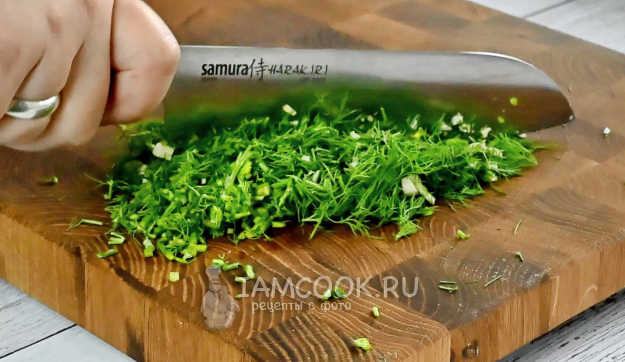 Раздавите ножом и нарубите зубчик чеснока, затем мелко нарежьте укроп. После чего соедините на доске укроп с чесноком и изрубите их в мелкую крошку. Не поленитесь, рубите не менее двух минут, чтобы укроп с чесноком выпустили максимум вкуса и аромата.