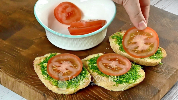На укроп выложите кружочки помидоров или разрезанные черри.