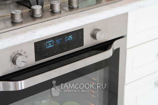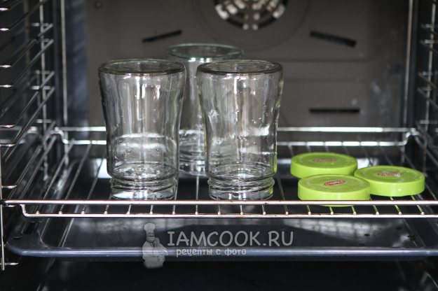 Я стерилизовала в духовке. На решетку горлышком вниз устанавливаем банки и стерилизуем их вместе с крышками 20-25 минут при 90 градусах.