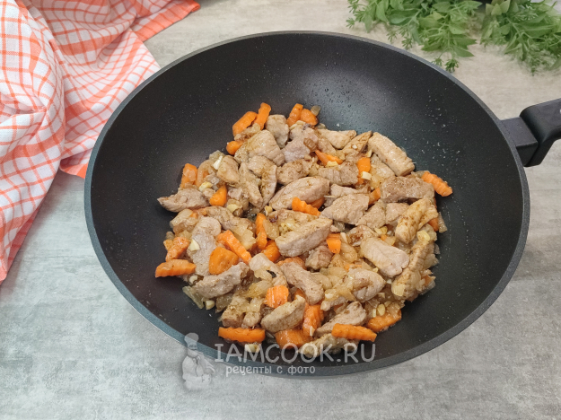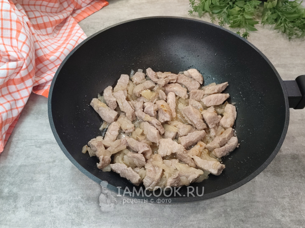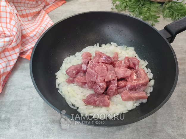 В сковороде разогрейте масло, обжарьте до прозрачности лук. Выложите к луку мясо, обжаривайте, периодически помешивая, до легкой румяной корочки.