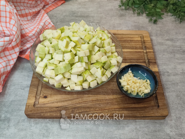 Чеснок измельчите, кабачки нарежьте кубиком, не слишком мелким.
