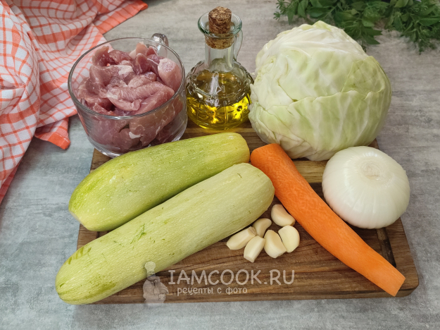 Соберите ингредиенты для приготовления тушеной капусты с мясом и кабачками. Поначалу может показаться, что слишком много капусты и кабачков. Нет, поверьте, они уменьшатся в объеме и получится оптимальный баланс с мясом 😉.