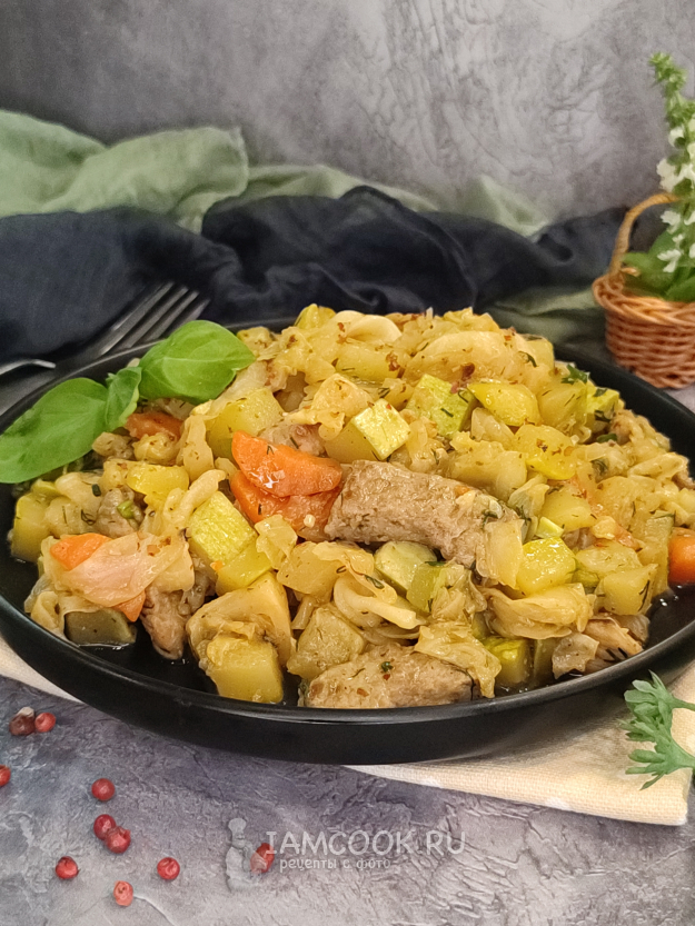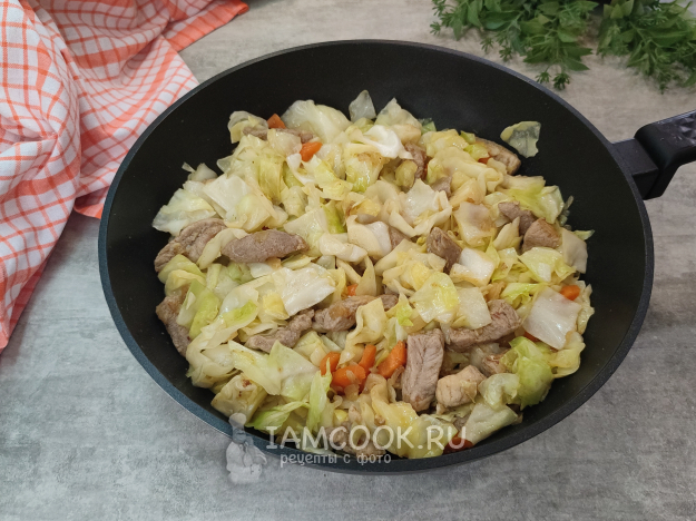 Тушим до мягкости капусты, периодически помешивая. Я воды не добавляла совсем, мне хватило сока от овощей. Как понять, что воды добавлять не нужно? Если ничего не пригорает, не образуется корочка на мясе, капусте - значит хватает собственной влаги для тушения. Если внизу продукты начинают покрываться корочкой, значит они уже жарятся, а не тушатся, в этом случае стоит добавить 0,5-1 стакана воды.