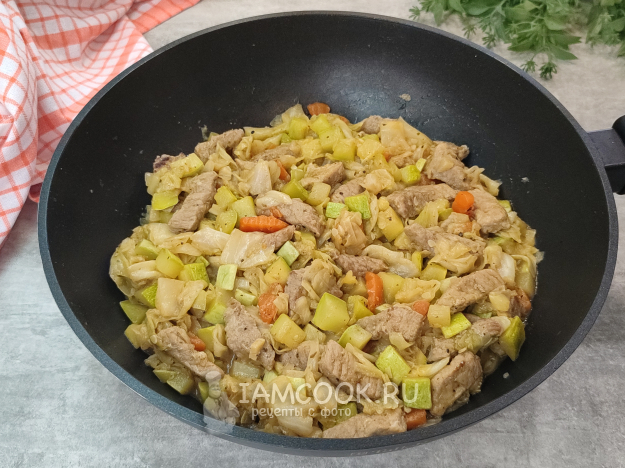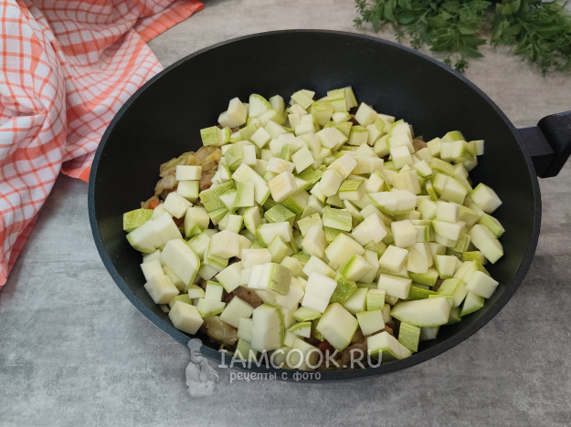 Когда капуста станет значительно мягче, уже будет практически готовой, самое время добавить в сковороду кабачки.