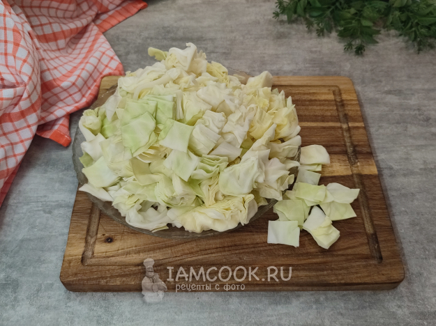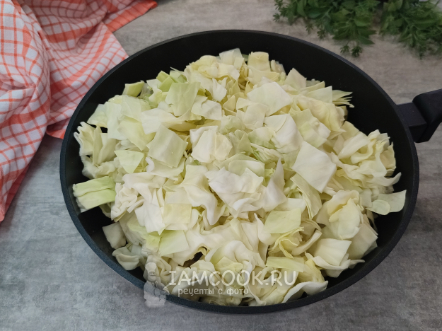 Теперь закладываем капусту. Сначала она очень объёмная, поэтому лучше и использовать большую сковороду - удобнее будет перемешивать.
