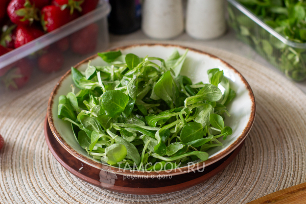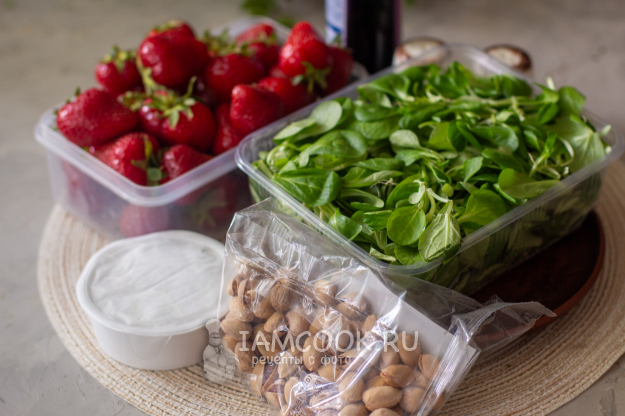 Соберите необходимые продукты для приготовления салата с клубникой и сыром бри. Вместо салата Валериана можно взять хрустящие листья Айсберга или другого салата. Фисташки можно заменить орехами Пекан или жареным Арахисом.