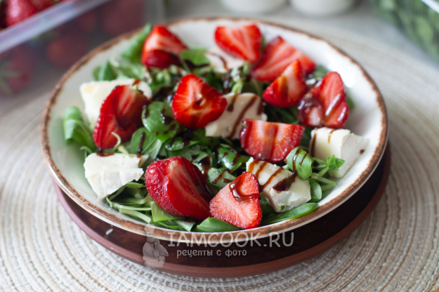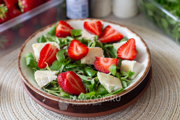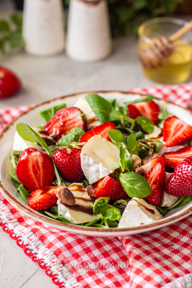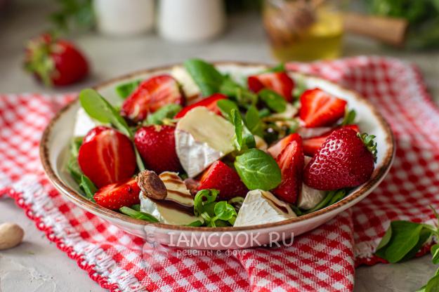 Полейте бальзамическим соусом, посыпьте солеными фисташками и подавайте салат с клубникой и сыром бри немедля.