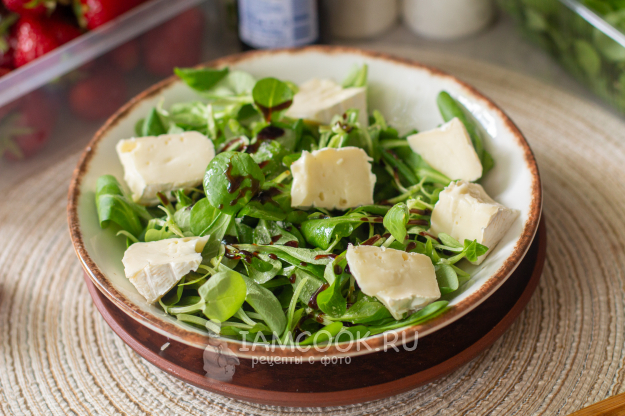На салат распределите нарезанный сыр Бри. Совсем слегка сбрызните бальзамическим соусом.