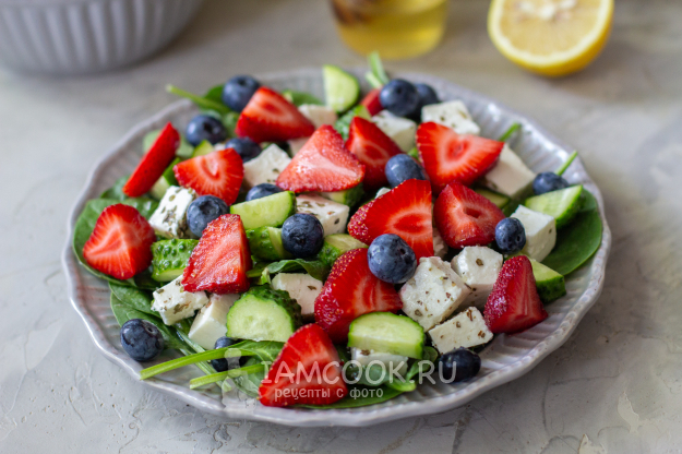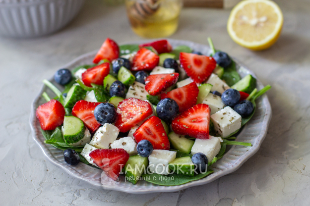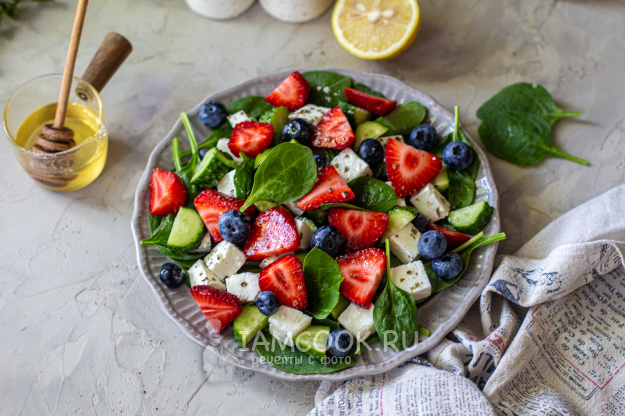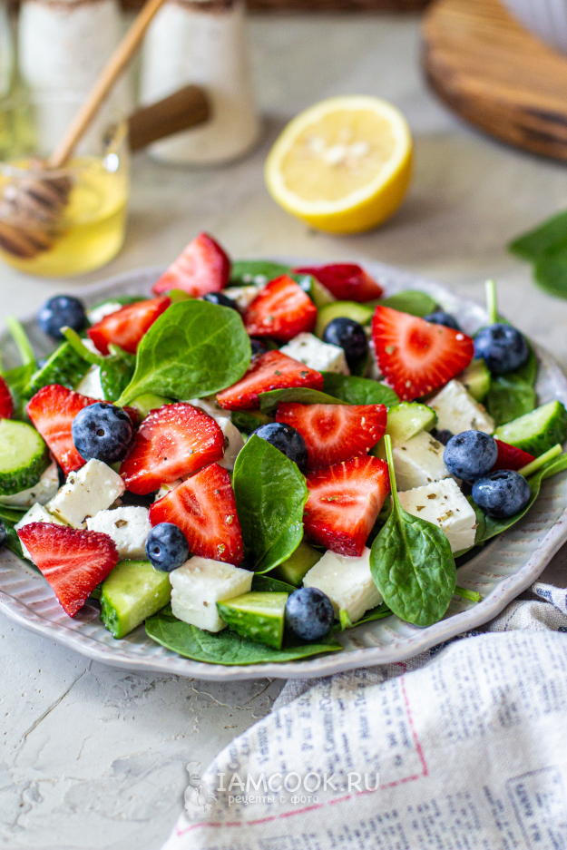 Свежую клубнику и голубику помойте, обсушите. Крупные ягоды клубники разрежьте на 2-4 части. Выложите ягоды на салат.